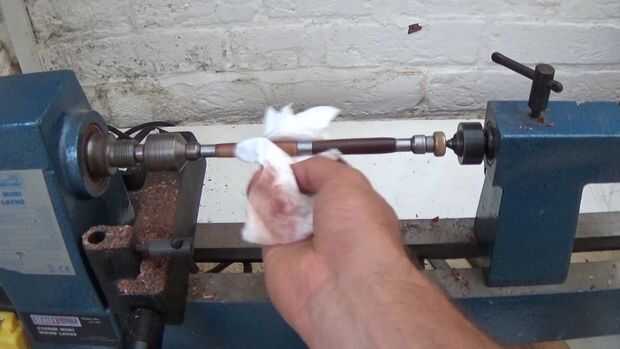Finalmente Monte los espacios en blanco de madera en el torno para el acabado. En el video utilicé cera de abejas pero un pulimento de fricción podría funcionar mejor. Frote el pulimento en la madera, esperar a la curación y entonces aplicar tantas capas más según sea necesario para lograr un bonito acabado brillante. Para la suavidad extra puede pulir la capa final con una lana de alambre/papel de lija de grano muy fino.