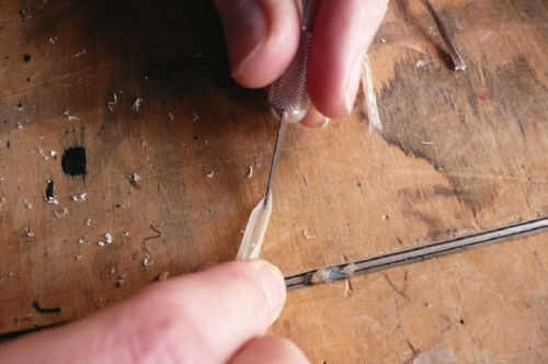 Se corta una ranura en el centro de la punta. Esto permite que la tinta fluya de la pluma.