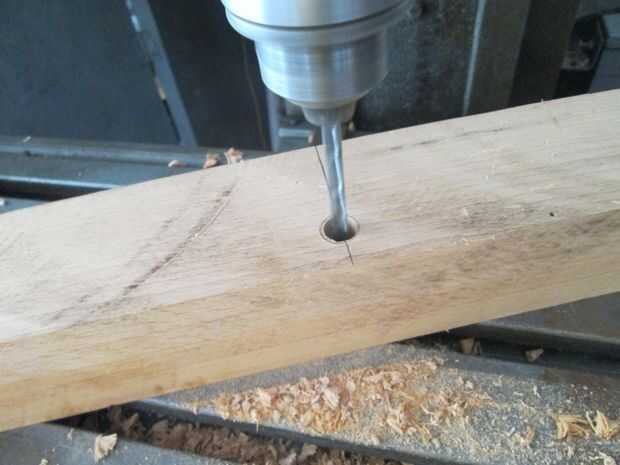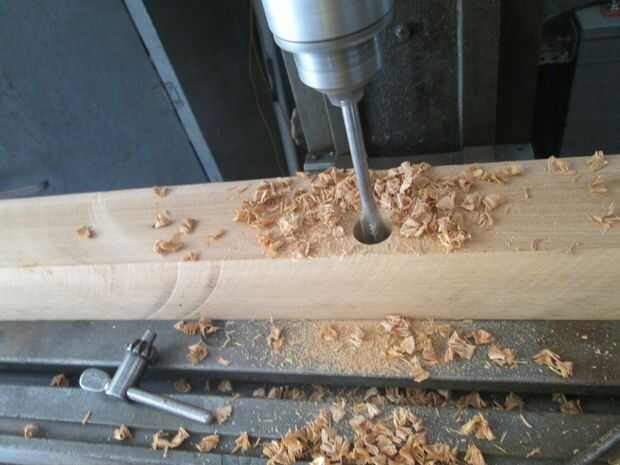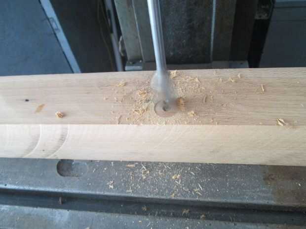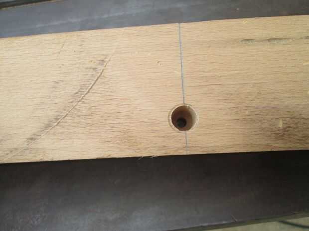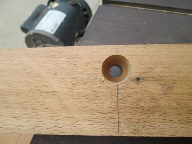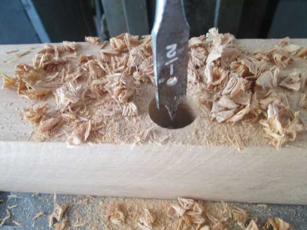 Cambialo hasta hacer tacos 1/2" y 1/4". Para hacer el 1/2 extremo del luminario, perforé un orificio de 7/8 1/2 forma en el tablero de roble. (1 3/8" de profundidad). Luego terminé el agujero con una 1/2" broca. La imagen muestra el agujero escalonado. Para el pasador de 1/4", perfore un orificio de 1/2" medio camino a través de la Junta y terminar con un 1/4" bits.