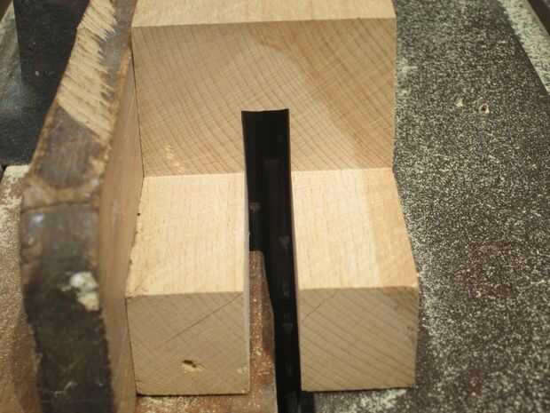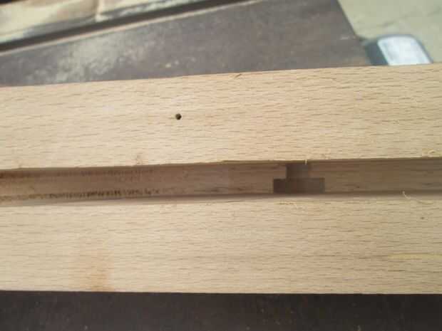 Coloque las hojas de mortajar hasta corte una ranura de 1/2" de ancho. Ajuste la profundidad va aproximadamente 1/16" en el orificio de 1/2" para el lado de la clavija de media pulgada. Hacer una ranura cerca de 12 pulgadas de largo en el tablero. La vista de la parte inferior muestra cómo la ranura acaba de abrir la parte inferior de los agujeros de guía un poco. Lo mismo para el pasador de 1/4".