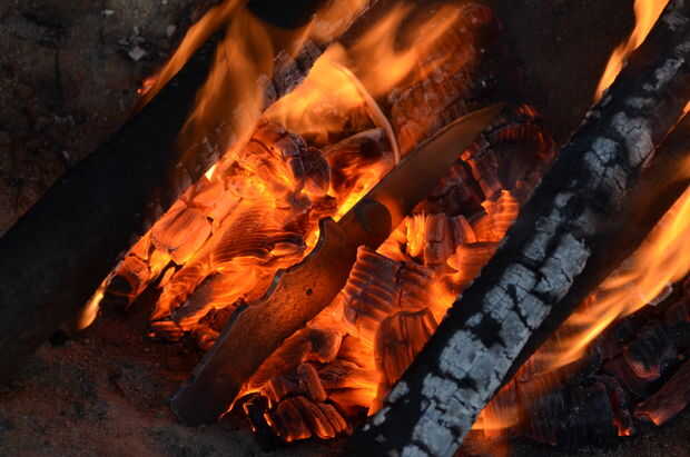 La cosa es, su grano no es perfecto ahora. Desea el grano al ser tan pequeño como sea posible, para reducir la posibilidad de agrietamiento y para un mejor rendimiento de corte. Para normalizar, traerlo hasta 1500 grados otra vez y dejarlo, borde, para enfriar el aire. Recuerde, la sal se derrite en 1479. Luego, tomar hasta alrededor 1414 y permita que se enfríe. Usted sabrá que estás allí porque un imán no se pegará a la hoja. Poner algo entre el imán y el disco. Si no, el imán se agrietará debido al intenso calor. Permita que se enfríe. Por último, llevarlo hasta un resplandor rojo pelado, un brillo menos intenso que en no magnético. Debe ser un rojo opaco, no brillante. Deje que se enfríe nuevamente. Quizás desee mantener el fuego va, puesto que en el siguiente paso, usted será calor tratamiento.