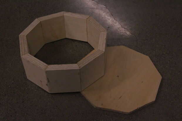 Hice el marco de mi tambor de madera contrachapada. Le di nueve lados. Usando grados tiene sentido para el número 9 porque 360 dividido por 9 es un agradable amistoso 40. Cada lado de un regular nonagon debe contribuir a 40 grados de convertir la acción.