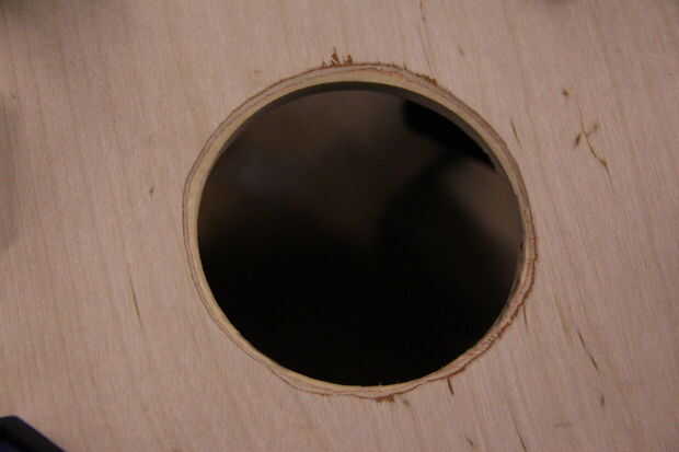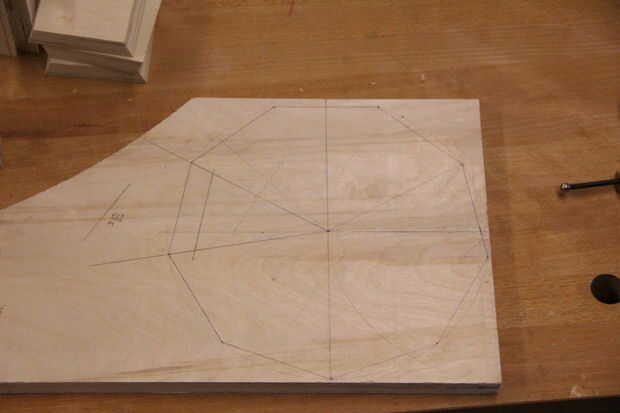 Después de que cure, trazado un acoplamiento nonagon de planchas de madera más delgados y que pegado a la espalda. Decidí cortar un agujero en la parte posteriora después de mirar fotos de banjo de Stanley Hick en Foxfire 3 por página 140. Buscar un .pdf de los libros de foxfire o haz de tu biblioteca. Tienen planes, imágenes y texto que son mucho más útiles que la mayoría de las cosas en internet.