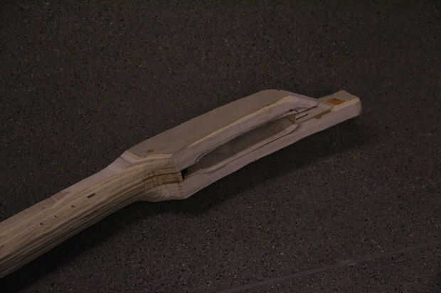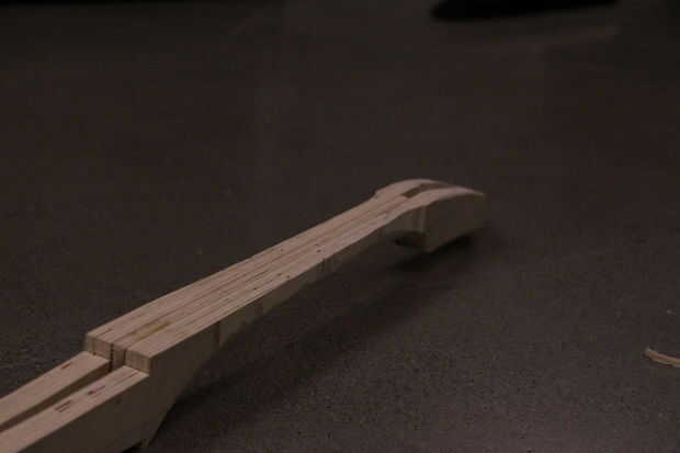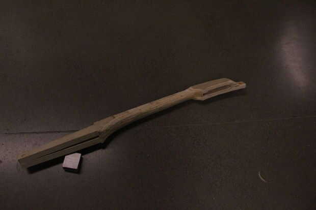 Hice el diapasón sección aproximadamente "D" forma, redondeando la parte inferior y los lados. La madera estaba usando tenía algunos vacíos, así que os adjunto un diapasón: una franja delgada y lisa de madera dura. ¿Utilicé un pedazo de (arce)? He encontrado en la basura. Fue bastante duro y ligeramente engrasadas. Era muy recto y liso ya no moleste lo de cepillado.