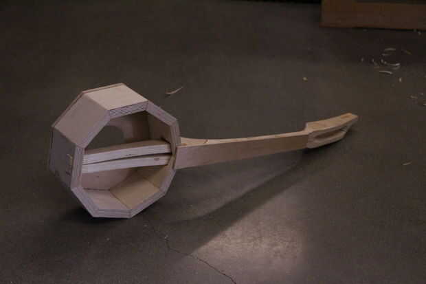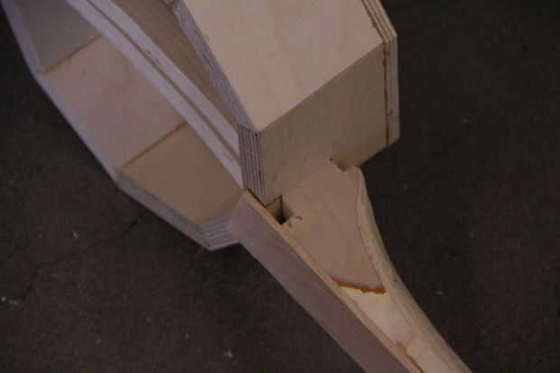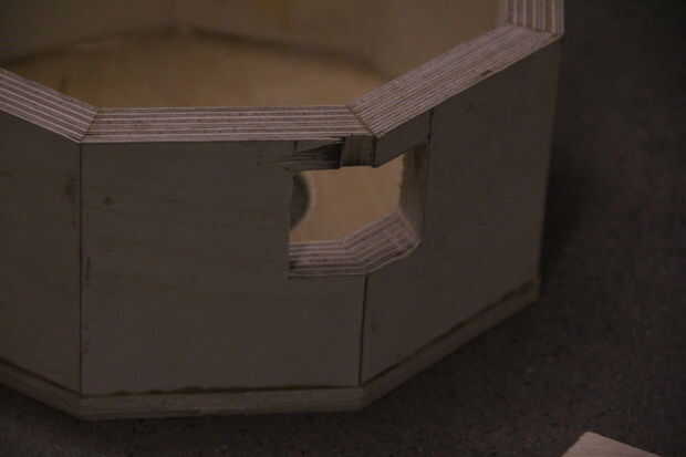 Este es el ajuste final de la inclinación del cuello, así que coloque los agujeros en consecuencia. Hecho el agujero más grande primero, luego inserta el cuello hasta que toca el interior pared en el lado opuesto de la estructura del tambor. A continuación, puede ajustar ligeramente el ángulo y la distancia desde la parte superior de la estructura del tambor a la espiga puede ser medida y registrada.