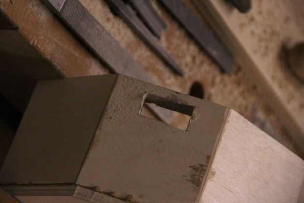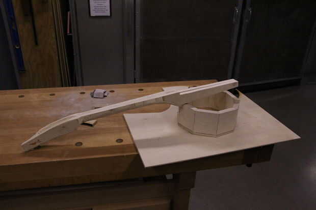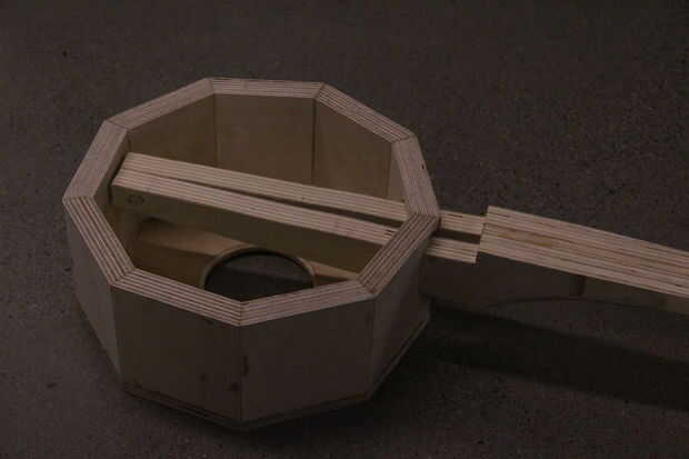 Para ello, medimos las secciones transversales que se asoman a través del marco de tambor. Hay uno cerca del extremo de la cejilla y otra en la punta de la espiga del cuello. Mina eran aproximadamente rectangular, así que grabé esas dimensiones y había transferida a la estructura del tambor. Había afilado el pico para que le sientan bien.