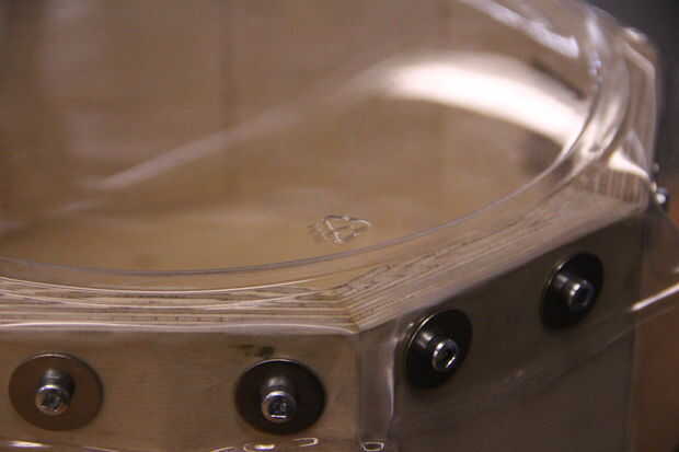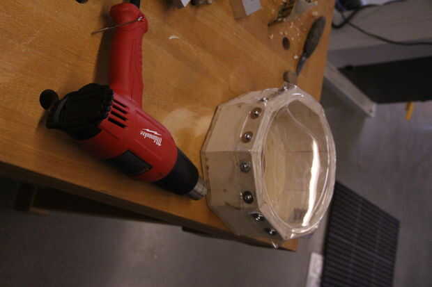 Cuando la 'piel' fue asegurada, utilicé una pistola de calor para calentar uniformemente toda la unidad. Empecé en los bordes, permitiéndoles apretar antes de trabajar hacia adentro. Creo que las áreas blancas opacas alrededor de la franja son oxidación de evidencia de donde calienta el plástico demasiado.