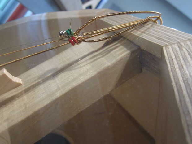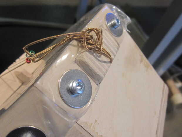 Os adjunto las secuencias bucle una cuerda de guitarra particularmente grasa a través del espacio en la punta unas cuantas veces y luego tirando el lazo hacia fuera la parte posterior del banjo. Todas las cadenas de reproducción fueron sujetados al bucle. Si tienes suerte suficiente obtener cadenas de extremo de bola, puede ser ceñidas alrededor de algo pasando el extremo de la cuerda a través de la bola para crear un bucle.