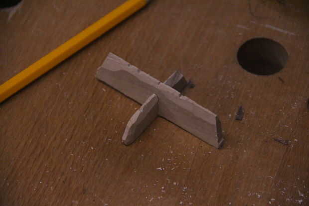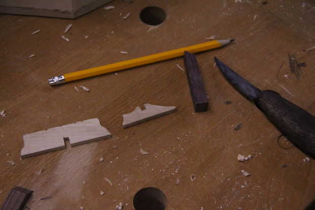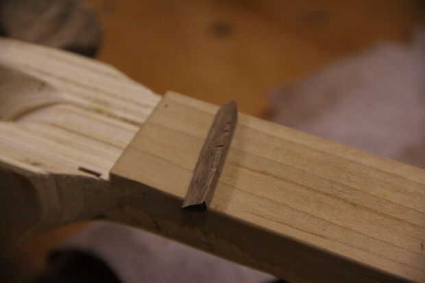 El puente se hace de la misma madera que usé para el diapasón. No era muy amplio y es probable que se caiga. Esto crea una satisfacción y generalmente benigna pop después de que los espectadores horrorizados cree que has destruido tu instrumento. Es un poco incómodo, así que hice una pieza ranurada anidación para ampliar su huella.