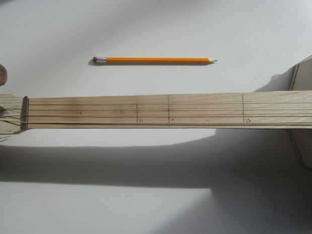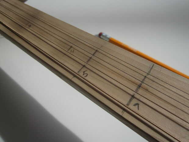 La primera vez que hice un instrumento sin trastes, garabateado marcas donde mis dedos sentían que los trastes deben ser. Eso es algo hecho por oído. Marqué a algunos más comunes para guitarristas como 7 (cuarto), 5 (quinto) y 12 (octava). Después de esos marcadores son hacia abajo, no es difícil interpolar entre ellos. Por el momento que las marcas de lápiz mancha lejos, no necesita más.