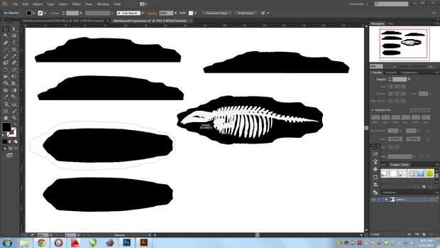 He encontrado un esqueleto de ballena en línea que quería usar para el arte de la Junta. Esto me inspiro a crear un esquema muy orgánico de la forma de consejos a seguir. Se puede ver en la foto de arriba las diferentes iteraciones que condujo a la forma final.