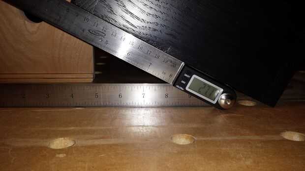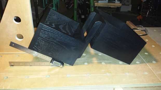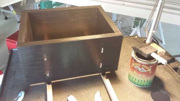 El último paso es crear los soportes de apoyo entre la caja base y la parte inferior. Montar dos cajas juntas, poner sobre la mesa de trabajo, utilizar un transportador y medir el ángulo entre la mesa y el borde de la caja y sería el ángulo exacto necesario.