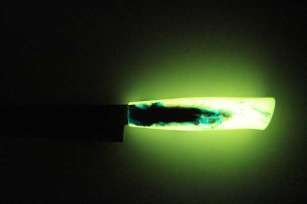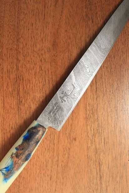 Este cuchillo de cocina es un 10 en máquina de cortar, con brillo en el mango oscuro epoxi.