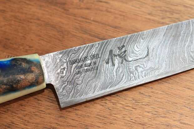 La hoja es forjada y endurecida por smith de lámina en California. forja de acero de Damasco es una forma de arte sí mismo. Mi post muestra mi enfoque para afilar y grabado de la hoja. Mi enfoque es en hacer mango personalizado. Modelo mango en programa 3d, derivar el molde para el modelo de mango, entonces impresión 3d al molde de la manija y el elenco se resina.