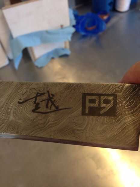 Le pregunté a un amigo a escribir caligrafía de mi nombre y el nombre de mi novia, aunque nuestro nombre tiene caracteres diferentes que pronuncia "yue". Exploró y había añadido el Logo de muelle 9. Rocíe la hoja con Cermark y las marcas en ambos lados de la hoja de grabado del laser.