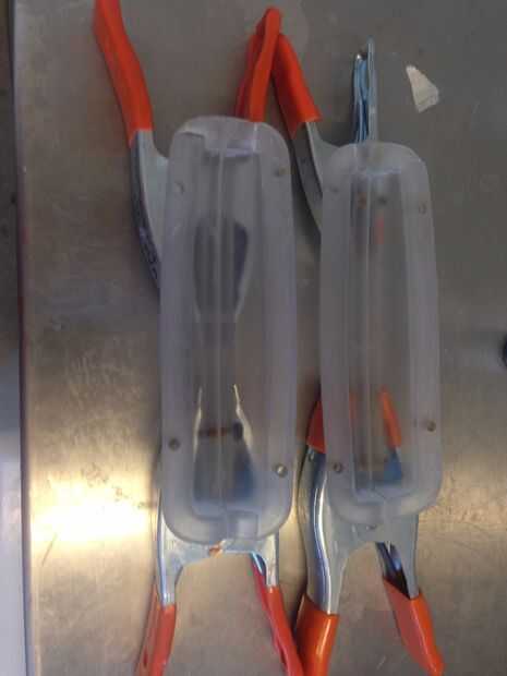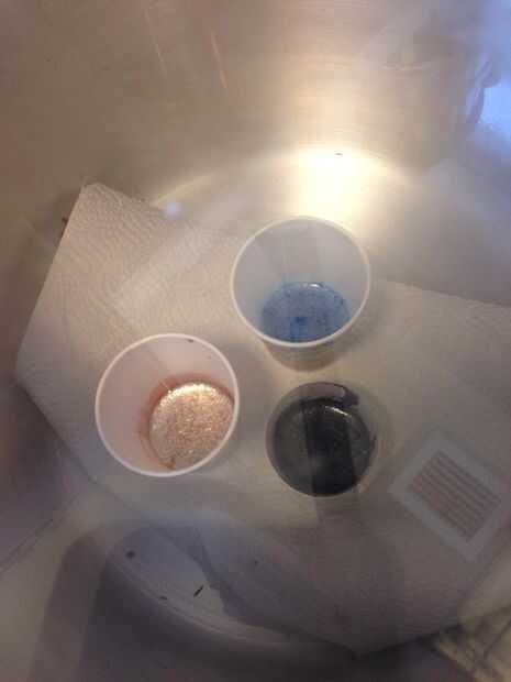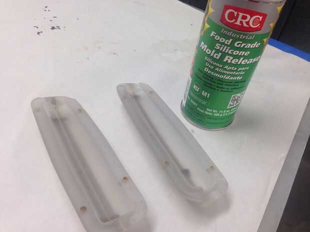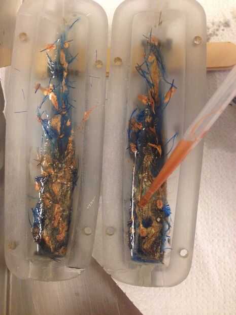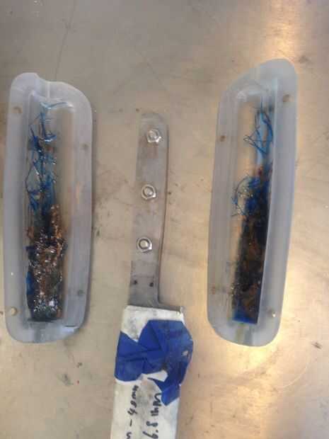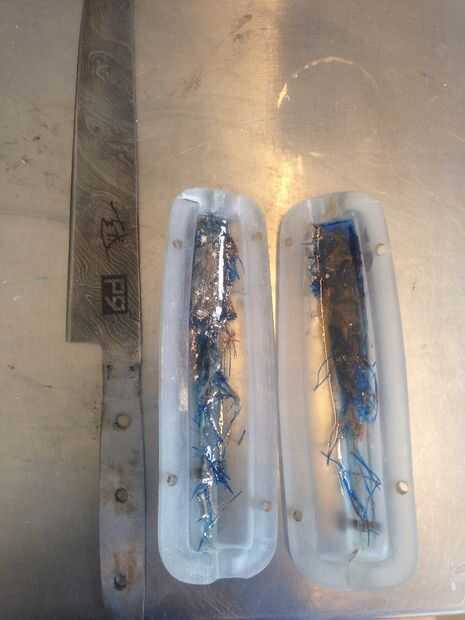 Taladré un agujero de verter 1/2 pulgada en el extremo del molde. aplicar a desmoldante de silicón en dentro y fuera del molde, mezcla colorante azul con fibra de vidrio para hacer fibras filtradas azul. Yo también han mezclado un lote de epoxy de fundición resistente a uv de alta calidad entonces dividir a los tres lotes. uno mezclado con polvo de mica, uno mezclado con polvo de grafito y por último uno teñido con colorante azul transparente.