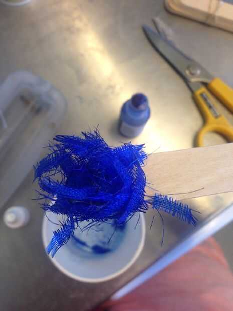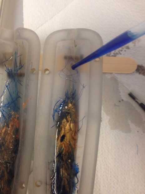 Coloco el molde plano y utiliza un gotero para dispensar un poco de resina azul y metálico, asegúrese de no mezclar dos. También cruce alguna fibra azul teñida en la resina. Lo hice de lado y deje que.