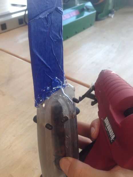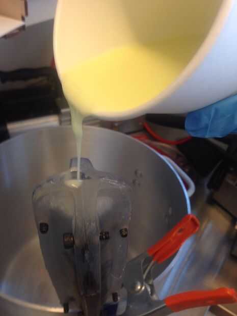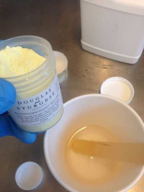 Una vez que el primer lote de resina de curado (24 horas más tarde) mezclé un resplandor en el oscuro resina para rellenar el resto del molde. la mezcla contiene resina transparente con pequeñas fibras y polvo fosforescente, mezcla de pequeña cantidad de polvo al principio, la resina debe ser semitransparente por lo que la luz penetre hasta la empuñadura. Vacío desgasifica la mezcla. ensamblar el molde de la 2 parte y selle todos los bordes con pegamento caliente. el molde translúcido se asegurará de que la hoja está en su posición vertical. llenar el resto del molde y dejarlo completamente curado.