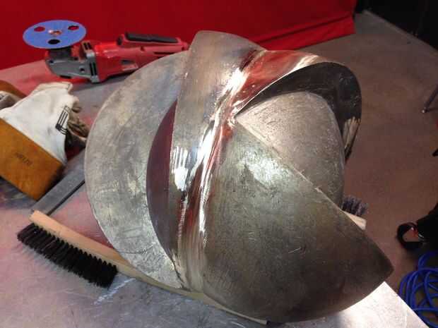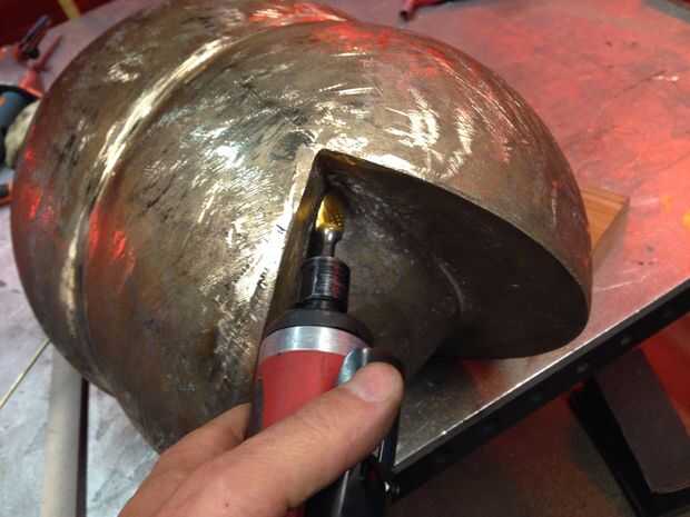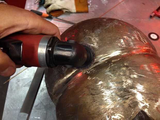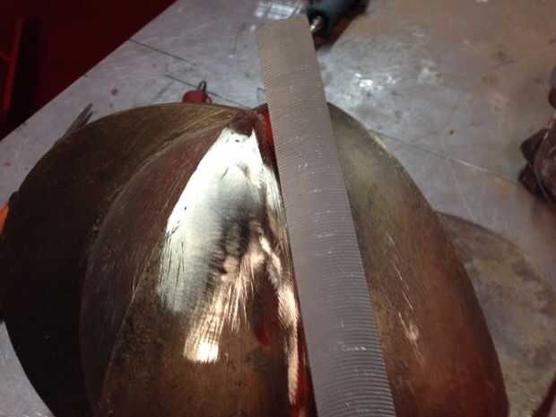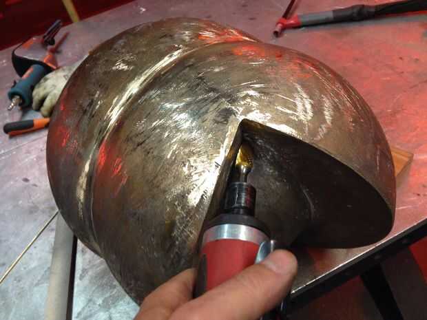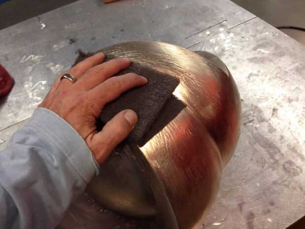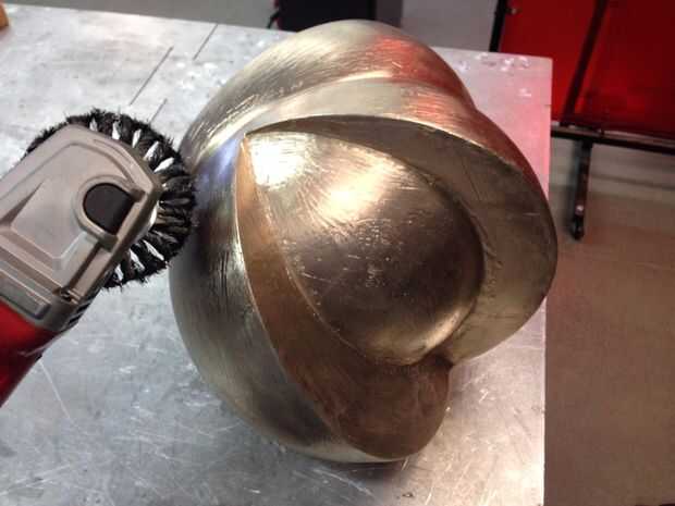 Después de que la pieza fue soldada con autógena totalmente, todas las soldaduras fueron vestidos con amoladoras angulares, mueren las amoladoras, scotch brite almohadillas de mano y una rueda de alambre. Las soldaduras fueron inicialmente vestidas con una 4 1/2" amoladora de ángulo, teniendo cuidado de no moler en la textura que trabajaba en la cera antes de fundición. Con el suelo de las soldaduras hasta que fueron un poco orgullosos de la superficie, luego usé un miniesmeril de ángulo recto con un pequeño papel de lija y scotch brite cojín hasta que las soldaduras se habían ido. Para crear una esquina agradable alrededor de la "cintura" de la pieza, usé un archivo para crear una línea fuerte por lo que las formas fueron combinados juntos pero independientes. Para algunos firmemente las esquinas interiores, usé un miniesmeril recta con un accesorio de las rebabas para hacerlos un poco más agudo. Luego frota toda la pieza con un scotch brite de mano y siguió con una rueda de alambre conectada a una amoladora angular 4 1/2" para preparar patinado.