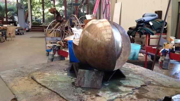 Nos aseguramos de que la pieza era limpia y libre de grasa y el aceite frotando con una solución débil "pepinillo" de ácido nítrico. Usted sabrá que está limpio si agua esclusas sobre la pieza sin abalorios. Mi amigo y colega, Karl Reichley, es un artista maestro pátina y generosamente se ofreció ayudar con esta pieza. El primer paso fue determinar qué quería la pieza para ver como. Juntos decidimos ir a por un castaño rico, orgánico o café de bellota. Para lograr esa tonalidad y el valor, Karl mezclado tres soluciones químicas acuosas: sulfuro de amonio, nitrato cúprico y Nitrato férrico. Se aplicó una capa base frotando la pieza con una solución de sulfuro de amonio débil para oscurecer un poco la escultura y acentuar la textura profunda de la pieza.