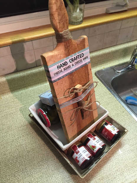 Ahora hice esto como un regalo para un amigo así que me fui más lejos con este proyecto para que sea más de una boda digna de regalo. Agregué un logo impreso con los colores de la boda y hecho un paquete con queso relacionados con mermeladas y otros artículos. Puse todo en unas pequeñas cestas y envuelto entonces toda cosa en envoltura de celofán cuando me la dieron a ellos