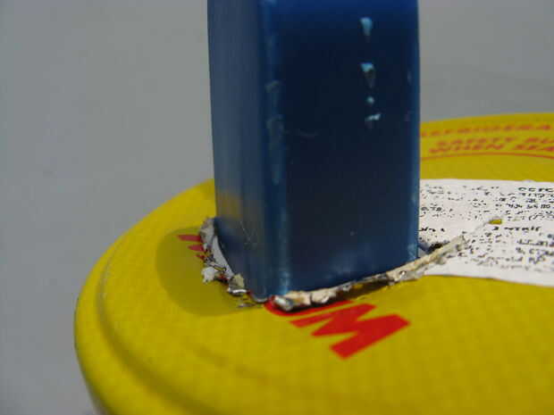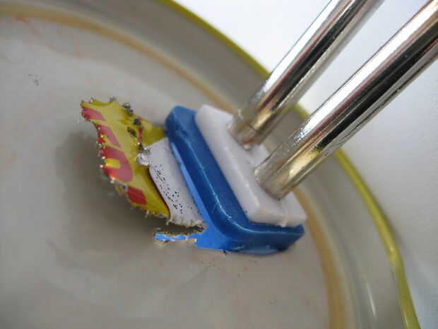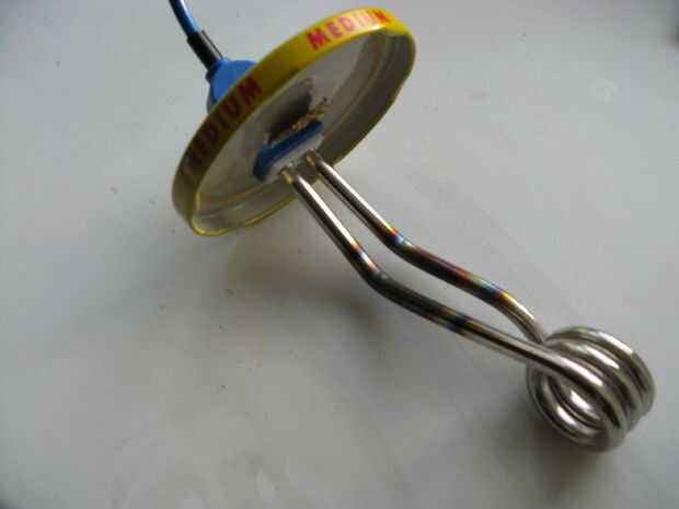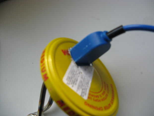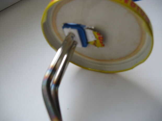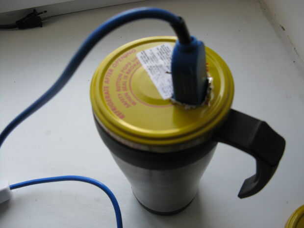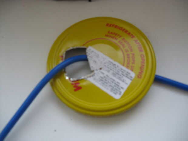 2. Corte un agujero en la tapa de la jarra sólo lo suficientemente grande para la base de la resistencia para caber comodamente en. Si el elemento de calefacción es como la mía y no es recto ellos Asegúrese de cortar el agujero suficientemente hacia el lado para que cuando usted elemento de calefacción se coloca en el agujero y la tapa de la taza, todavía caben en la taza.