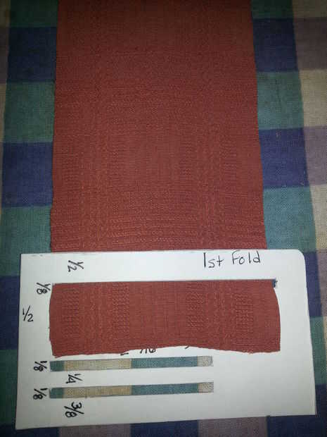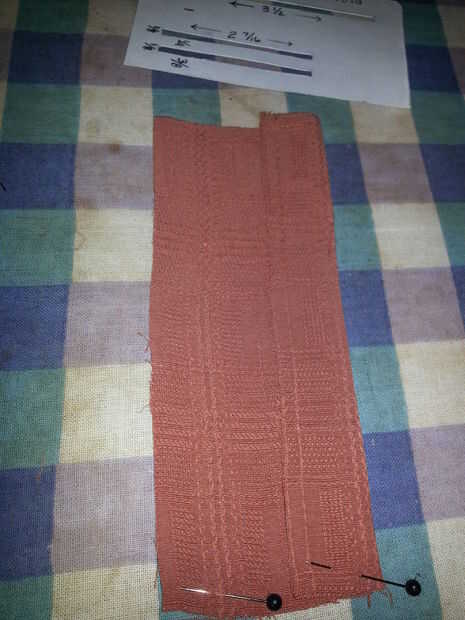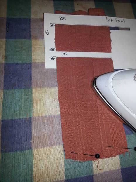 Manteniendo el borde a la izquierda, doblar sobre el borde derecho de la tela de la armadura en la parte posterior de la ranura de la segunda y luego de vuelta al frente por la tercera ranura, manteniendo a la tela acostado. Cuando es a través de la ranura de la tercera, hacer ajustes y use la plancha para presionar la pequeña porción que es a través y el pin hasta la almohadilla de planchado la tela que se ejecutó a través de las ranuras. Ahora jale con cuidado la plantilla de la porción fijada abajo y continúe presionando a la tela con la plancha al mover la plantilla.