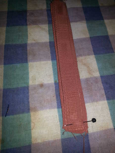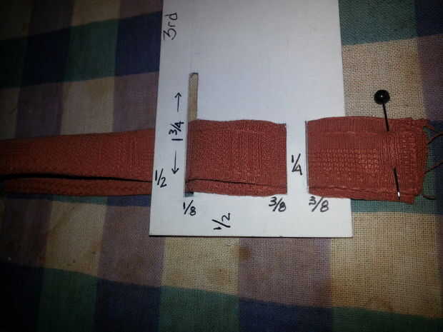 Desde el otro extremo de la cinta, parte de la tela hacia abajo, tejer su tela a través de las ranuras como se indica en la plantilla 1: tejiendo el paso de la tela, ajuste el tercer doblez para encajar en las ranuras de segunda y terceros.