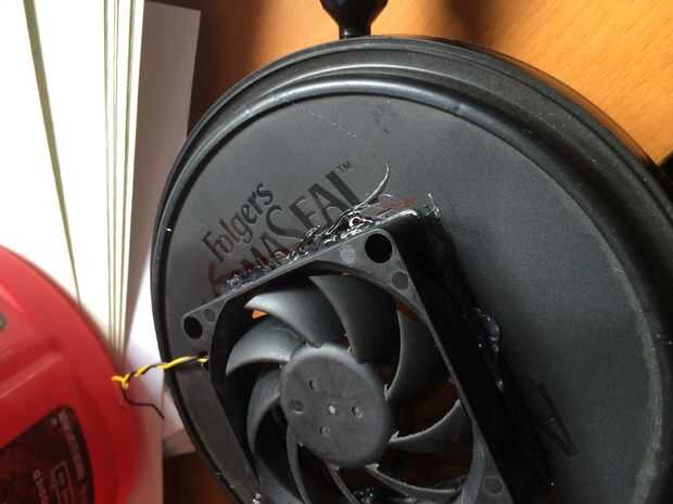 Cortar el agujero un poco más pequeño que usted trazó y caliente pegamento que el ventilador apuntando hacia abajo.