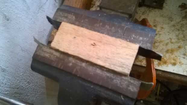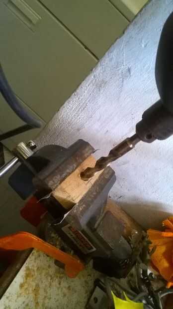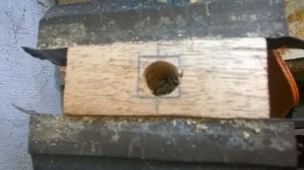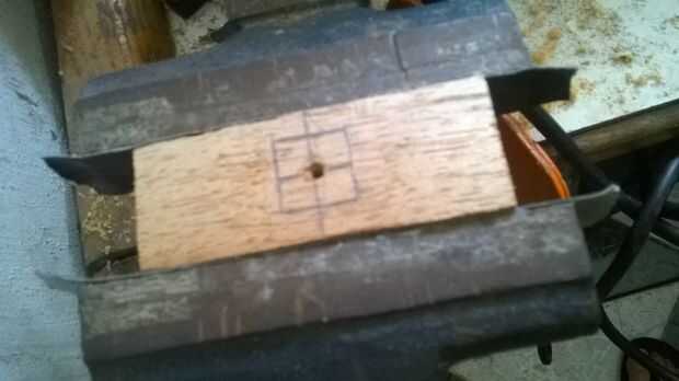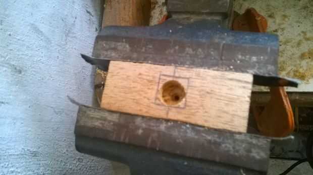 Coloque el bloque de madera en centro de prensa de tornillo y marca de Plaza como se muestra. A continuación, perfore un orificio de pequeña guía tan recto como sea posible a través de todo el camino. Mediante una mayor broca (no más grande que la Plaza), medio camino a través del taladro, flip block y usando el cubo de azúcar, trazar el otro lado de la cuadra, (como en el centro como sea posible) y acabado agujero.