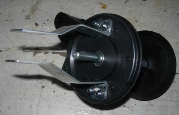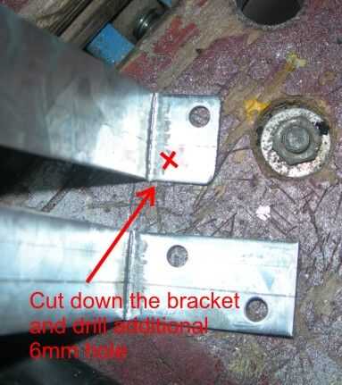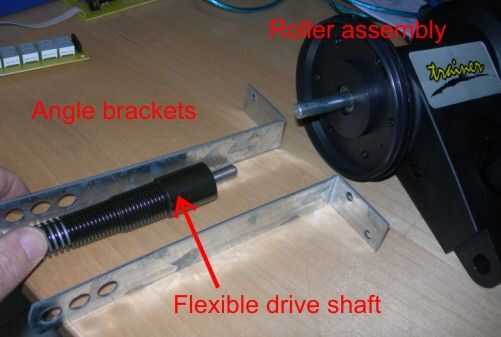 Las escuadras se pernos para el montaje de rodillo plástico. Ajuste que deben cortarse un poco y un agujero perforado. Los soportes deben ser doblados un poco para que sostiene el disco flexible en la posición correcta, en línea con el eje del impulsor de rodillo. Esto puede hacerse manteniendo el soporte en un tornillo de banco y golpeando con un martillo.