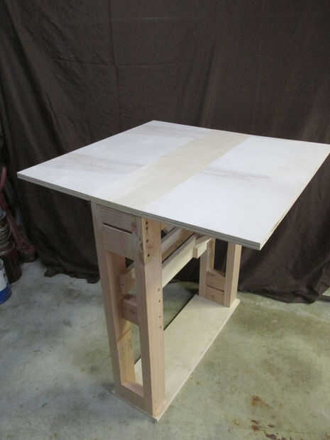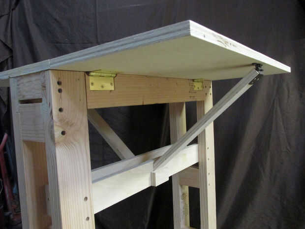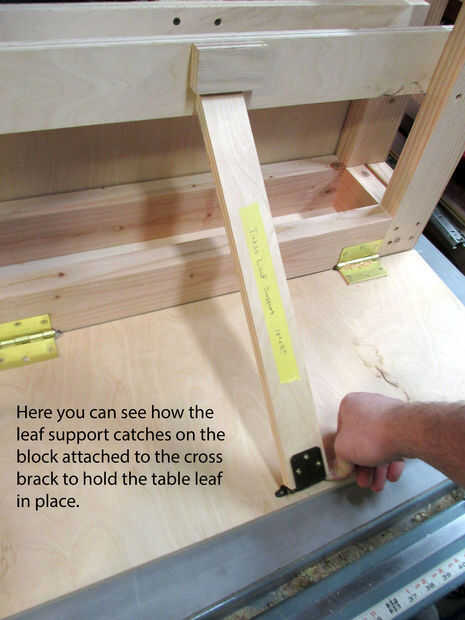 Una vez que los soportes transversales se atornillan en el siguiente paso es construir que la hoja soporta. los soportes de licencia consisten en la pieza de madera contrachapada se corte antes (18 "X 3") y un 3/4 bisagras. Los soportes de hoja de madera contrachapada Obtén un 45 grados corte en un extremo y la bisagra instalada en el otro. Se instalan como se muestra en la imagen, (determinar donde deben ser instalados empuje el extremo de 45 grados de la hoja de apoyar firmemente contra el bloque unido a la cruceta y coloque el extremo con la bisagra contra la parte inferior de la hoja de tabla. Marque los orificios de instalación de bisagras y tornillos de la bisagra en el lugar. porque la superficie de la mesa de la máquina se coloca contra la superficie de trabajo plana las hojas de tabla deben ser perfectamente niveladas con el centro de la mesa después de completar la instalación del soporte de la hoja.)