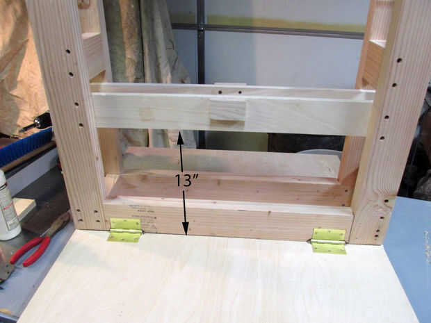A continuación, la máquina todavía sentado boca abajo sobre una superficie plana medida desde la parte inferior de la tabla deja 13" y hacer una marca en cada una de las patas de 2 X 4. Estas marcas son donde deben instalarse las vigas cruzadas (véase el cuadro por una representación visual). Utilice los tornillos de 1" para fijar las vigas transversales.