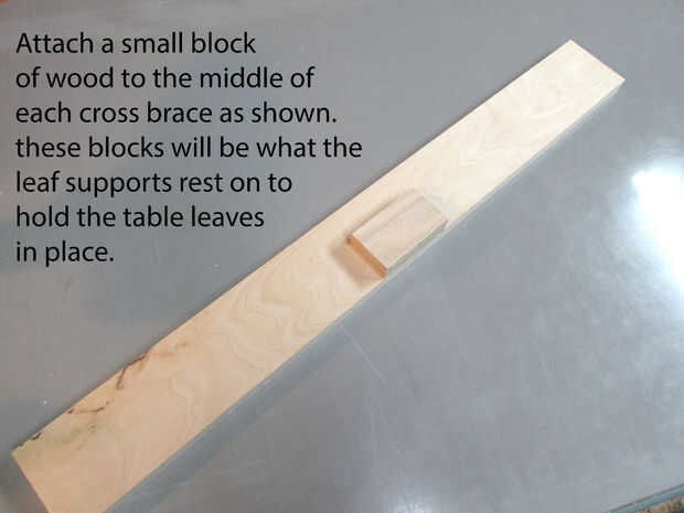 Iniciar este proceso de fijación de un bloque de madera contrachapada de 3/4" hasta el centro de cada uno de los soportes transversales. el bloque debe ser aproximadamente 3" de largo y cerca de 1.5" de alta; Este bloque será la hoja de lo que es compatible con resto contra para sostener la tabla deja en la posición extendida.