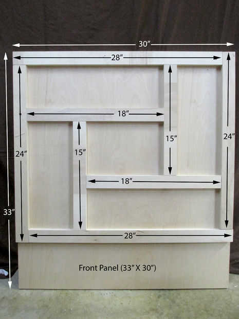 El panel frontal de la máquina se compone del panel frontal que fue cortado desde el 3/4" madera contrachapada (33" X 30") y todas las tablas de ajuste que fueron cortadas desde el 3/4" madera contrachapada (2" de ancho y longitudes variables). Las placas de ajuste son una parte importante del panel frontal, además de añadir a la estética de la máquina que también acumulan el espesor de la parte frontal para que cuando se unen la parte posterior y los paneles de delante de la estación para que el piso que ambos son el sentarse a la misma altura.