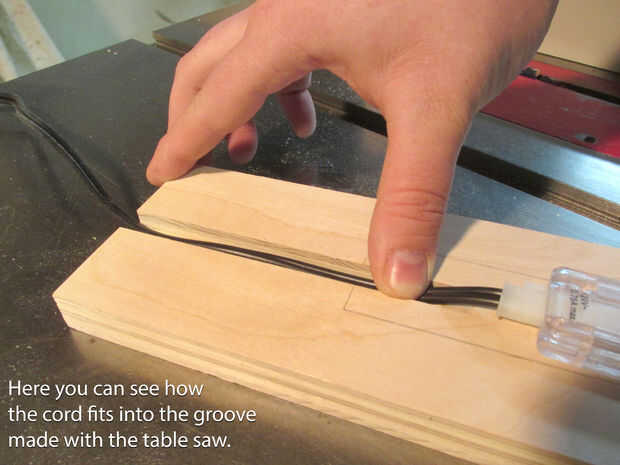 - Mientras que las otras piezas se están secando, tomar luz brazo #3 y corte una ranura 1/4 ancha que es sobre 1/4 profundidad en medio de ella. Tenga en cuenta que esta ranura no se extiende a través de toda la longitud de la Junta; en cambio sólo llega unos 5 o 6 pulgadas. Esto se hace ejecutando que el tablero sobre la mesa la hoja de sierra y parar después de que ha cortado más o menos 5 pulgadas en (consulta el cuadro para ver lo que me refiero). Después de que usted ha hecho una reducción la Junta fuera de la hoja, más su cerco sobre ligeramente y hace otro paso para aumentar el ancho de la brecha, para asegurarse de que todos mis recortes terminaron en el mismo lugar que utiliza un bloque de tope con abrazadera a la cerca, una vez más, echa un vistazo la fotografía para ver lo que quiero decir.