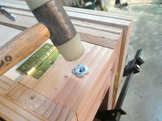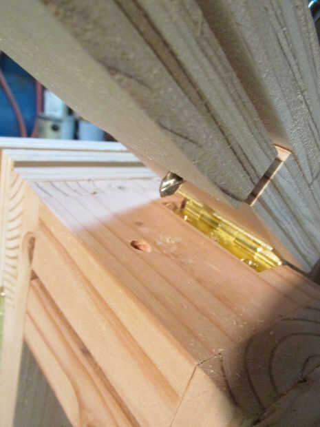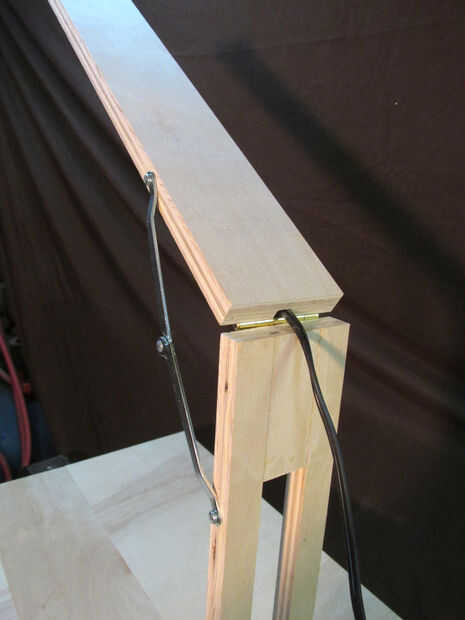 Comenzar ubicando el lado de la estación de la máquina donde se instalará la luz, puede hacer referencia a los cuadros en el primer paso para ayudar con esto. Una vez que has encontrado el lado correcto, instalar una bisagra de 2" como se muestra en la imagen, tenga en cuenta que la bisagra es mortaja profunda, similar a cómo las bisagras fueron empotradas en las ayudas de la pierna. Con un lado de la bisagra unida a la estación de fabricante, conecte el otro lado para el ensamblaje de la luz como se muestra en la imagen.