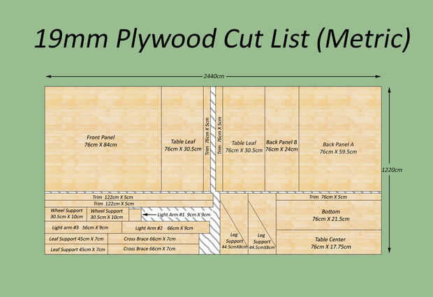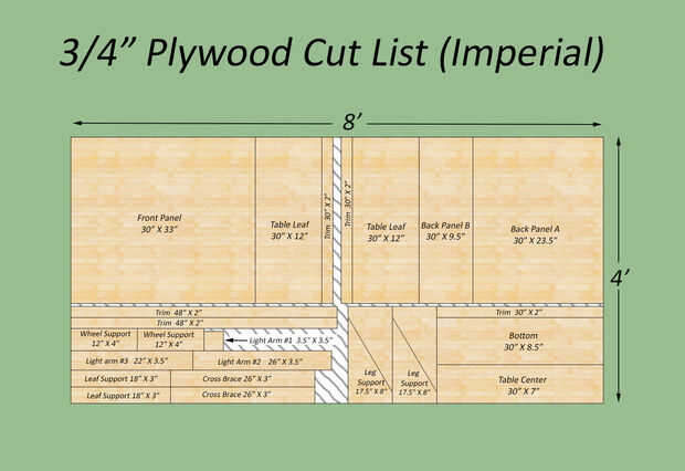 Sugerencia: si eres como yo y no tienes un vehículo lo suficientemente grande como para transportar una hoja completa de 4' X 8' de miedo de madera contrachapada no. Diseñé el diseño de piezas de madera contrachapada para que puedan tener la hoja de contrachapado cortado en cuatro secciones en la tienda de mejora de hardware/hogar sin dañar las piezas. Ver la foto de arriba para obtener un ejemplo de cómo se puede dividir la hoja para su fácil transporte.