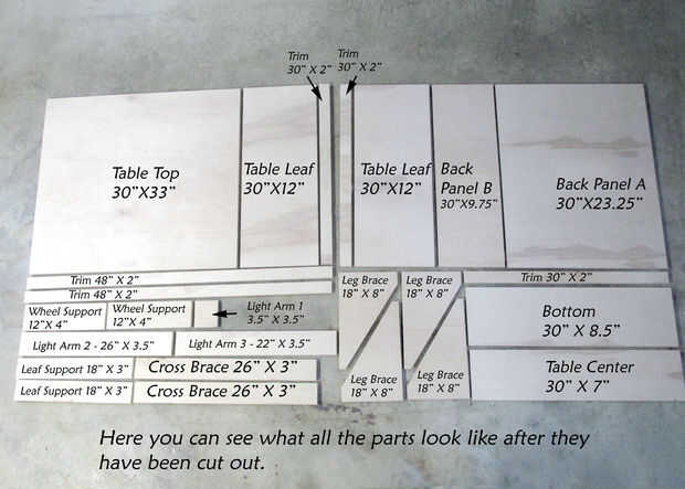 El primer paso en la construcción de la estación de la máquina es cortar las distintas partes de la madera contrachapada de 3/4" y 2 X 4. En la foto superior son diagramas de las distintas partes que necesitan cortar y sus medidas, estos son los esquemas mismos que utiliza para crear mi fabricante de la estación y me alegra informar que todas las partes alineadas bien y salió perfectamente. (Incluí una versión métrica de la lista de piezas para todos los afortunados que hay que no crece con el sistema de medidas Imperial).