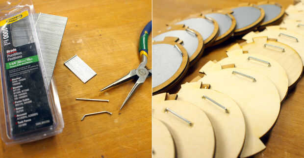 Después de taladrar agujeros poco profundos en el centro de la parte de atrás de cada medalla que utiliza pinzas para doblar doblado clavitos de acero en forma de U poco profunda, éstos entonces fueron insertados en los agujeros piloto con un poco más de epoxy y encajan en su lugar.