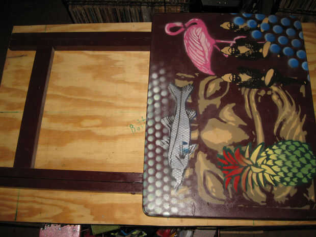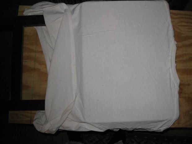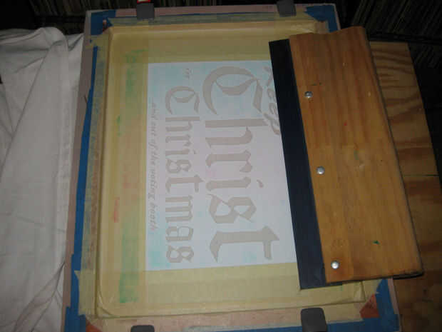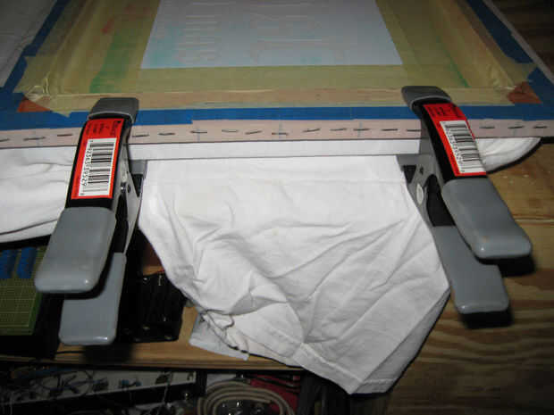 Impresión de la pantalla es básicamente una técnica de stencil. Mientras que una plantilla tiene que ser una pieza donde se conecta cada elemento de la imagen, acoplamiento de la pantalla nos permite tener piezas más pequeñas, separadas y más detalle. Para transferir la imagen a la pieza de trabajo, necesitamos una superficie plana, la tinta y una escobilla de goma para empujar la tinta a través de la pantalla. Para una imagen de un color básico funcionará cualquier superficie plana que puede estirar una camiseta encima. Usé la superficie plana de una pequeña mesa plegable. He alineado la camisa y sobre él colocan la pantalla preparada. Usé las abrazaderas de muelle para sujetar la pantalla firmemente en su lugar. He mezclado un poco de pintura acrílica con medium textil y difundirlo en un lado de la pantalla. En este caso usé dos colores de tinta para crear un efecto de fade. Me sostuvo firmemente la boquilla contra la pantalla en un ángulo de 45 grados y tiró de él hacia mí, forzando la tinta a través de la pantalla y sobre la camisa. He quitado la pantalla y deje que la camisa se seque.