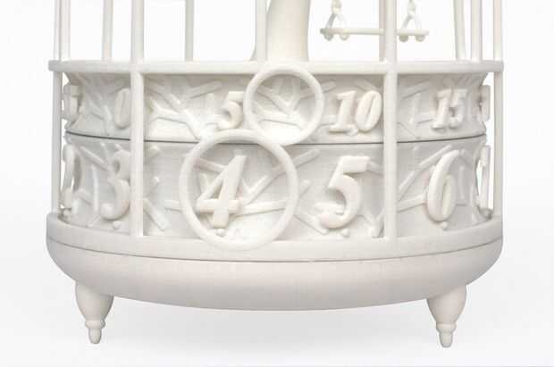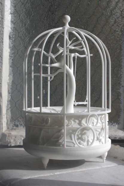 La jaula y el cuerpo del reloj han sido creados usando Solidworks para asegurar que todos los componentes montados juntos cómo queríamos que además de tener todos los espacios de la derecha. Por otro lado, el árbol fue creado usando un brazo háptico y el programa de modelado 3D Freeform. El brazo háptico hace modelar una forma orgánica como el árbol más intuitiva y natural, como un escultor podría crear un objeto en un material como la arcilla o plastilina. Forma libre le permite al modelo "arcilla virtual" agregando y talla la forma de como vas. El brazo háptica se aplica fuerza sientes las superficies de sus modelos para que puedas tocar, tirar y ajustar la arcilla en la forma exacta que desee. El reloj entero entonces ha sido impreso por Shapeways en 5 partes a través de láser selectivo (SLS) proceso de la sinterización y luego reunidos alrededor de un mecanismo de reloj de alta calidad 3D.