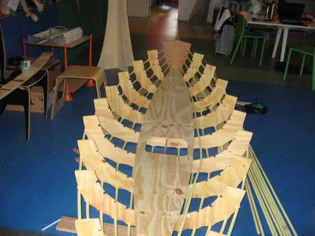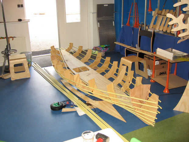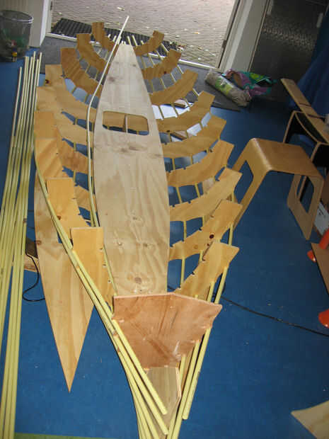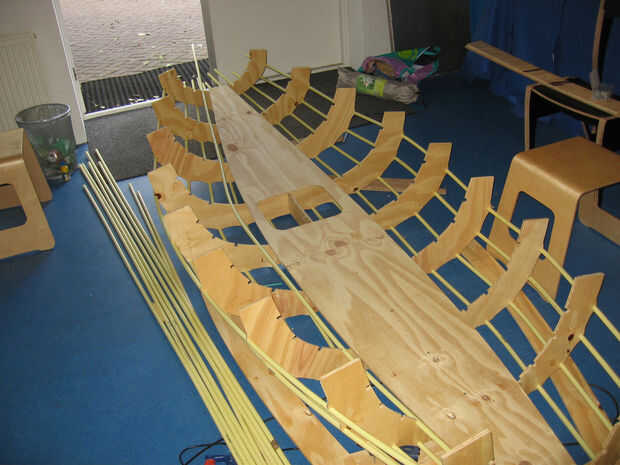 De lo contrario comenzar sólo con poner el piso en algo como un banco o un taburete. Asegúrese de que permite el ascenso de la quilla + suelo de popa. Ahora poner la parte de keelsom en él y solucionarlo poniendo una estación intermedia en su ranura. Poner el resto de las estaciones en sus ranuras y muévase un poco hasta que esté satisfecho de la veracidad de todo. Antes de comprometerte a él, Compruebe la equidad mediante la inserción de un tubo en las ranuras lo más cerca posible de la borda. Si serpientes alrededor, tienes las estaciones intercambiadas y debe corregirlo antes de continuar (sí lo sé, estaba en un apuro con el prototipo y lamentó no corregirlo).