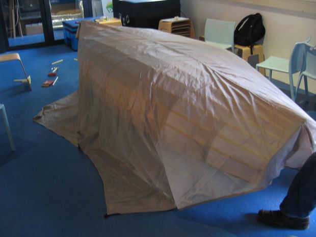 Comencé una sección media del barco pegado a la tela con pegamento de contacto en el borde y la parte superior de la cubierta. En las estaciones 2 y 6 hice una costura en algo exceso de tela. El arco necesita su propia sección de la tela, en parte porque la longitud de mi tela no era suficiente. Así la sección de proa tiene una gran costura a lo largo de la estación 1 y una parte la costura alrededor de la parte redonda del arco. Pegué a la tela con cemento de contacto 'Pattex transparente', que hace el vínculo más fuerte en las pruebas que hice anteriormente. tensiones en la tela no son que alta, y la fuerza es bastante alta, así que creo que no cualquier cemento de contacto que es resistente al agua y se adhiere al poliéster.