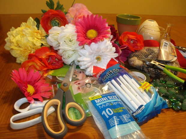 Necesitarás algunas flores falsas. No, no, no la harina esta vez! ¡ Flores! Usted también necesitará una pistola de pegamento caliente y palillos, cinta de floristería verde, tijeras, un cortador de alambre y un montón de plumas. Algunos lindos floreros y macetas para poner son buenos. Decoraciones como cinta, guijarros de cristal, etc. también son agradables.