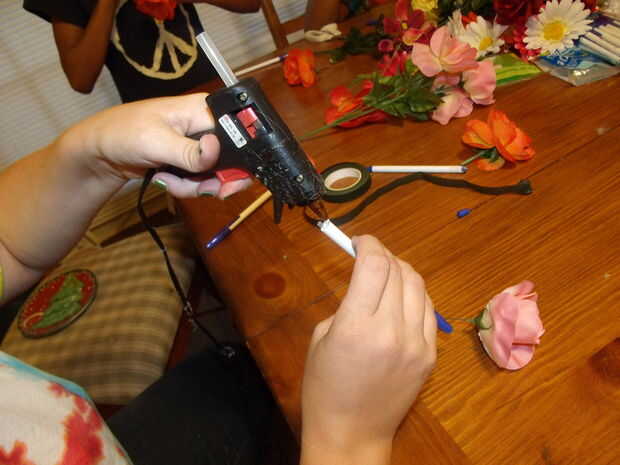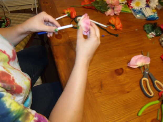 Pop el extremo de la pluma.  Poner un poco de pegamento caliente en el extremo de la pluma y deslice el cable por el interior de la pluma en cuanto sea posible, por lo que la parte inferior de la flor termina pegado hasta el final de la pluma.  ** Asegúrese de que el cable va al lado del tubo de tinta, no en el tubo de tinta.  Créanme, quiere evitar ese tipo de lío!