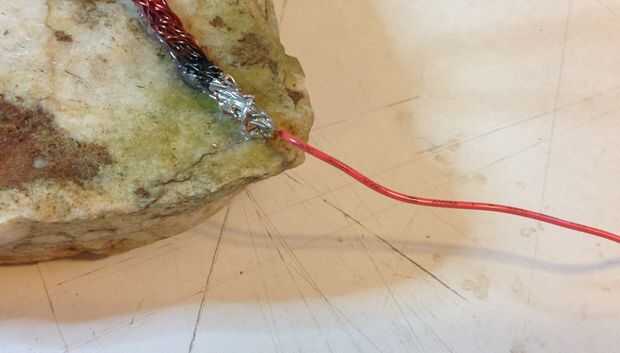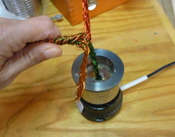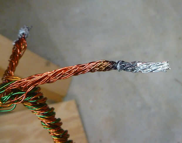 Ahora sumerja una de sus raíces de los árboles en el bote. Usted necesitará solamente hacer las raíces verdes y rojo. El cable color cobre es sólo para mostrar, aunque no duele nada para tira de estaño lo. Palillo de la raíz en lo suficiente por lo que obtener los cables perdidos, más cortos. Deja el manojo de alambre de la soldadura durante unos 15-20 segundos. Esto da el tiempo de soldadura para quemar el esmalte de los alambres - te ver/olor algo desagradable de humo de la olla. Ahora con cuidado saque la raíz, deja que se enfríe (la soldadura se enfría muy rápidamente) Repita con las otras raíces. Sus raíces ahora ser peladas y estañadas.