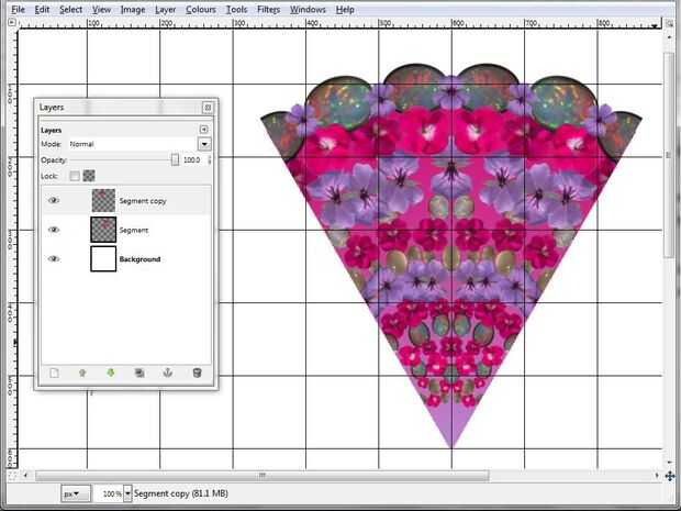 - Trabajando en el segmento de la capa, seleccionar todo y gire (herramientas, transformar, rotar) punto 600.600 (el punto que será el centro del mandala) por 15o. Capa, ancla de capa.