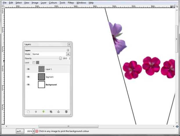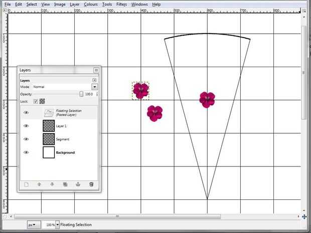 Crear una nueva capa transparente (como en el paso 3) y lo llaman capa 1. Trabajar en esa capa, pero con la capa de fondo blanco y dos visibles del segmento. Archivo, abrir para abrir una imagen conveniente (una de las dos florecillas fucsias, en el ejemplo) y a continuación, seleccione toda la capa que contiene la imagen pero no el fondo. Editar, copiar. Pega en la capa 1 (editar, pegar) pero no ancla todavía. Cambiar el tamaño a algo adecuado con la herramienta escala, recordando a vincular la anchura y la altura en el cuadro de diálogo para mantener la proporción correcta. Colocarlo en algún lugar en el centro del segmento, en la línea de centro vertical. Antes que con copia de la capa, ancla, ancla (control+c) y pasado un par de ejemplares (Control V) hasta el lienzo pero fuera del segmento. Ello tendrá el efecto de anclar las imágenes primeras y segunda. Arrastre la imagen tercera de segundo para que pueda ver.