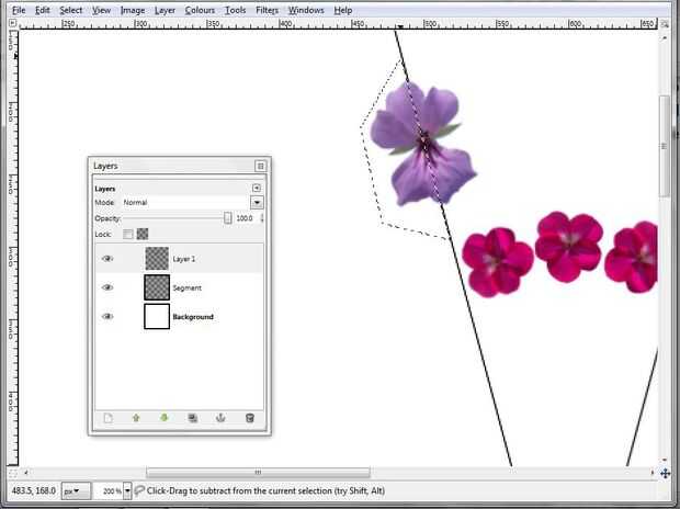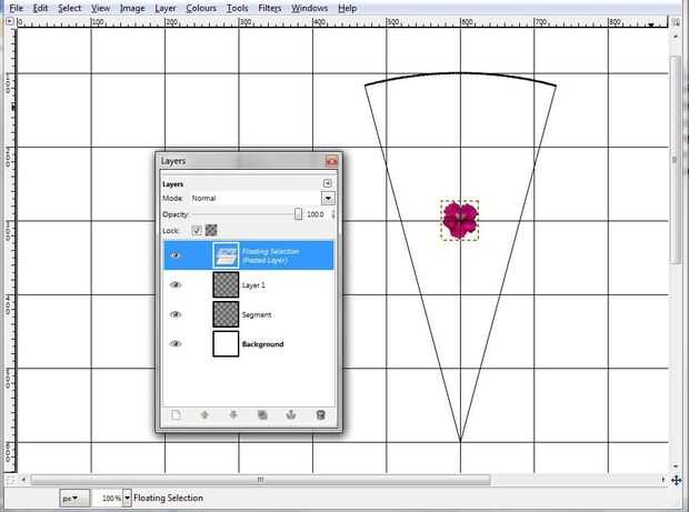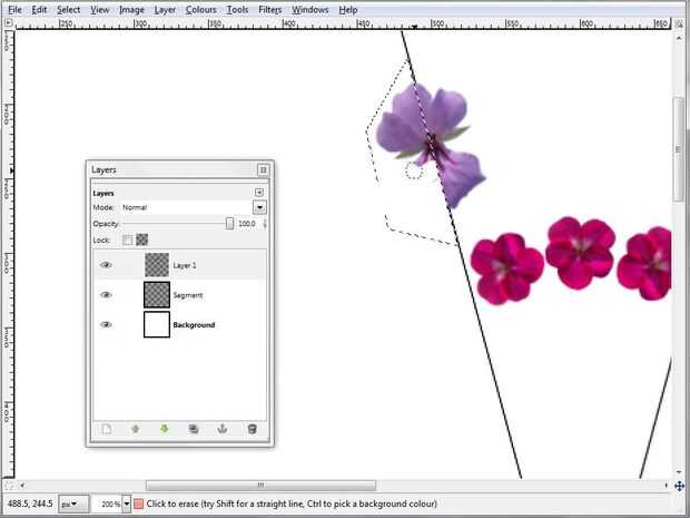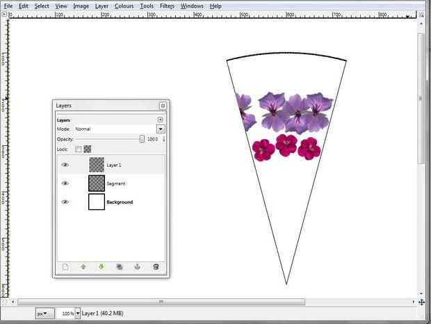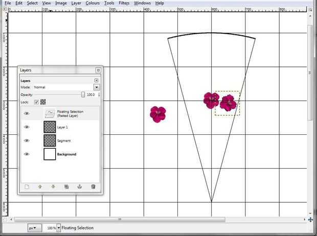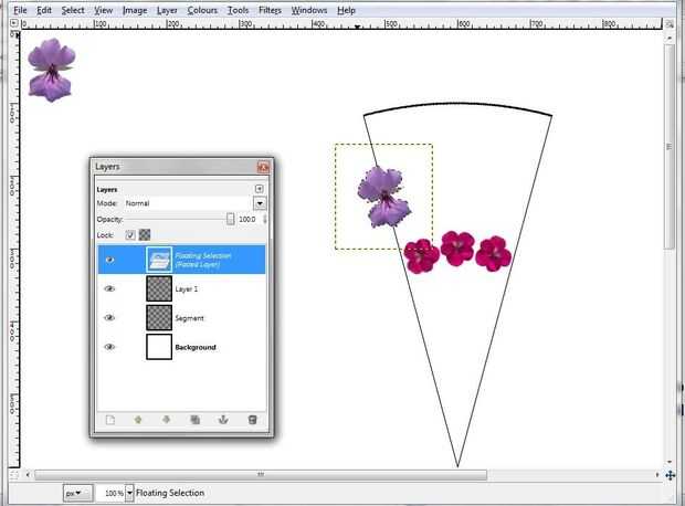 Algunos elementos diferentes (es decir no fucsias florecillas, o al menos, no es la misma imagen floral fucsia) en la misma capa, los más pequeños cerca del punto y más grandes hacia el arco. Permiten algunos toque los lados o se superponen a mitad de camino. Cuando tienes una imagen que se superpone, usted tendrá que deshacerse de la porción de lo que está fuera del segmento. Hacer zoom y utilizando la herramienta seleccionar libre para seleccionar un polígono alrededor de la zona a depilar, a continuación utilizar la herramienta Borrador para frotar hacia fuera. Seleccione Ninguno para anular la selección cuando haya terminado.